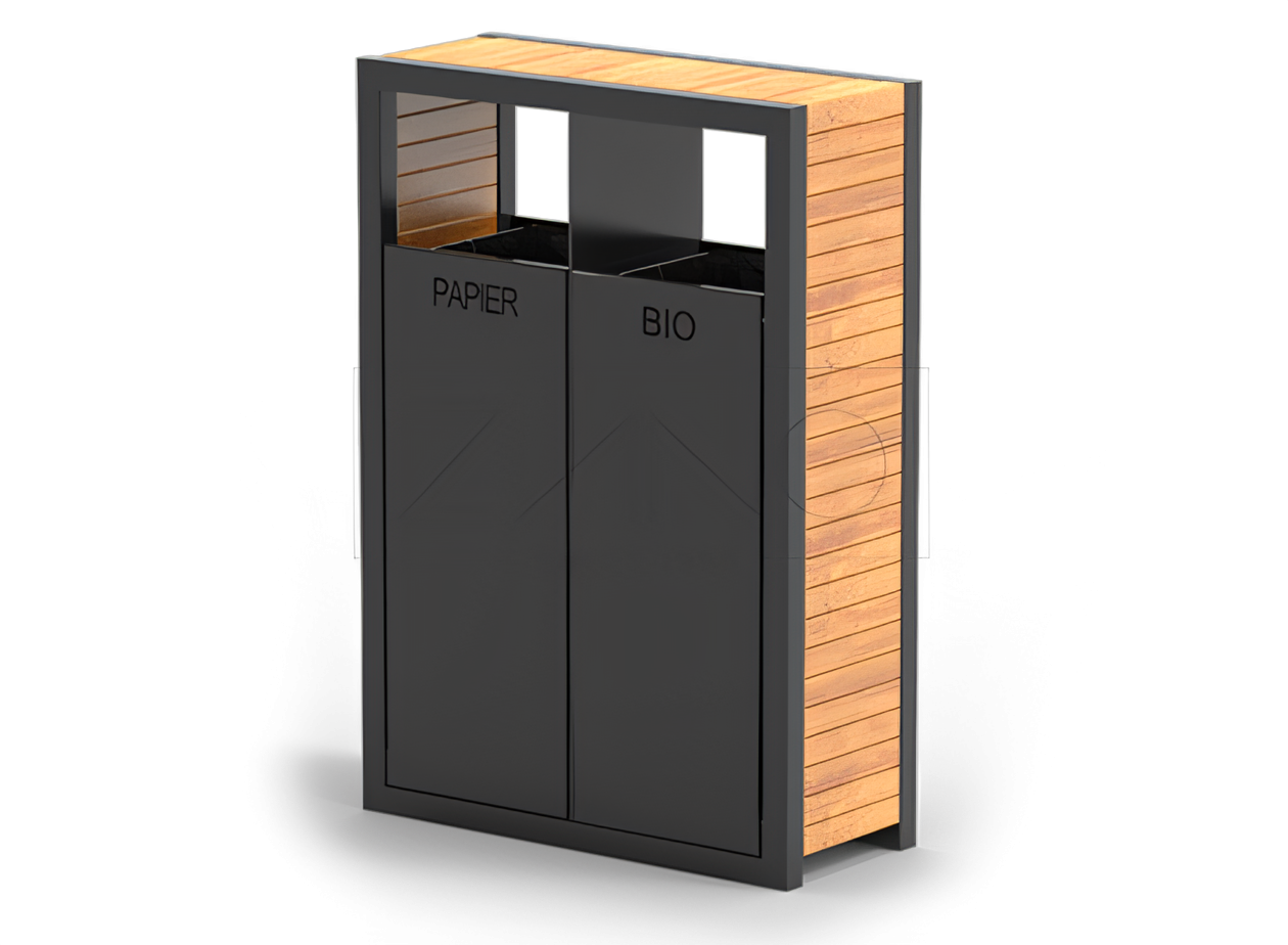 Kaksikammioinen Pavo 15.263-kierrätysastia on vankka kaupunkijärjestelmän jäteastia, jossa on moderni, universaali muotoilu, joka on viimeistelty kiinnittämällä huomiota pienimpiinkin yksityiskohtiin. Rakenne - on valmistettu teräksestä, jossa on puinen viimeistely. Teräs voi olla joko hiiliterästä, sinkittyä tai jauhemaalattua asiakkaan määrityksen mukaan. RAL-väri tai ruostumatonta terästä. Puu - valintasi mukaan eurooppalaista havupuuta, kaksinkertaisesti lakattu asiakkaan määrittämä väri tai eksoottista puuta (suojattu öljyämällä). Vaihtoehtona puulle voimme käyttää HPL-levyä tai kori voidaan valmistaa kokonaan teräksestä. Sisävuoret - Korissa on kaksi sisävuorta, jotka on valmistettu sinkitystä metallilevystä. Niihin pääsee käsiksi kätevästi kallistamalla korin etuosaa. Kiinnitysmenetelmä - Korin peruskiinnitystapa on ruuvaamalla kori kiinni perustukseen. Tilauksen räätälöinti - Koriin voidaan leikata merkintöjä käyttötarkoituksen mukaan (esim. paperi, metalli, sekoitettu), ruostumattomaan teräkseen voidaan kaivertaa tietoja tai logo. Koriin voidaan kiinnittää tarra.