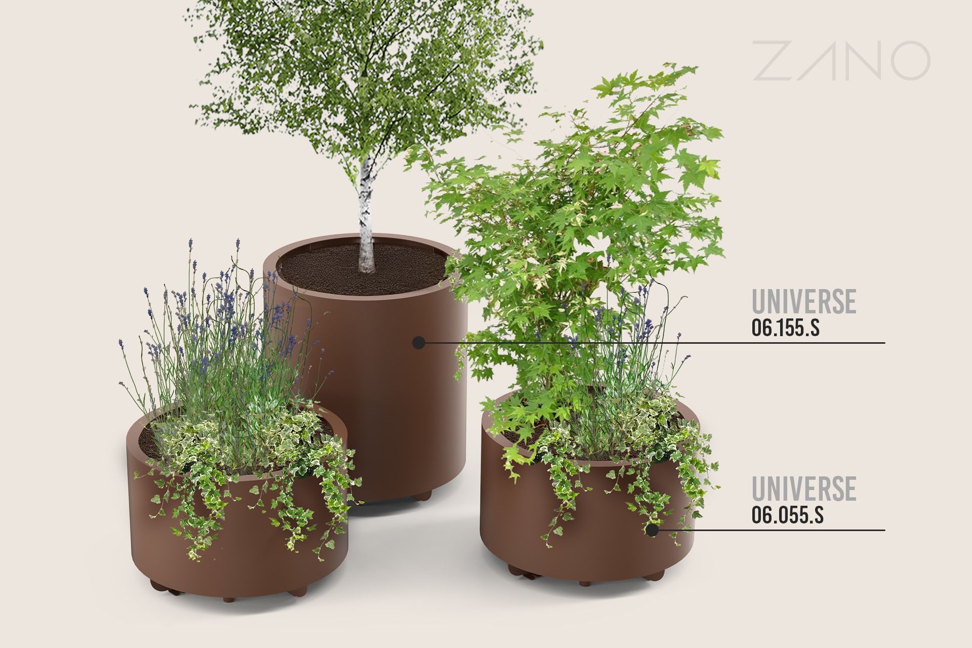 Universe 06.155.S ruukku on korkeampi versio S-kokoisesta ruukusta, joka kuuluu Universe-sarjan kaupunkikalusteisiin, kuten ruukkuihin ja penkkeihin. Se voidaan yhdistää Universe 02.455.3 -penkkiin yhtenäisen tilakokonaisuuden luomiseksi. Rakenne on valmistettu 2 ja 3 mm:n paksuisista S235JR-hiiliteräslevyistä, jotka on suojattu galvanoimalla ja pulverimaalaamalla RAL-luokituksen mukaisesti, tai valinnaisesti ruostumattomasta teräksestä 1.4301 kiillotettuna versiona. Ruukun pohjassa on neljä tyhjennysaukkoa, jotka varmistavat ylimääräisen veden asianmukaisen poistumisen.
